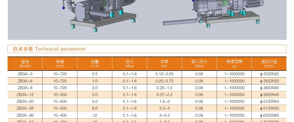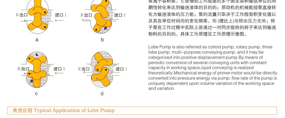 ZB3A系列膠體泵-又稱羅茨泵、不銹鋼轉子泵、凸輪泵、萬用輸送泵、酵母泵、蝴蝶泵、三葉泵、鞋底泵、藥料泵、熱溶膠體泵、顆粒膠體泵、渣料泵、蛋白渣泵、高濃漿泵等,依靠兩個同步反轉動的轉子在旋轉過程中于進口處產生吸力(真空度),從而吸入所要輸送的物料。